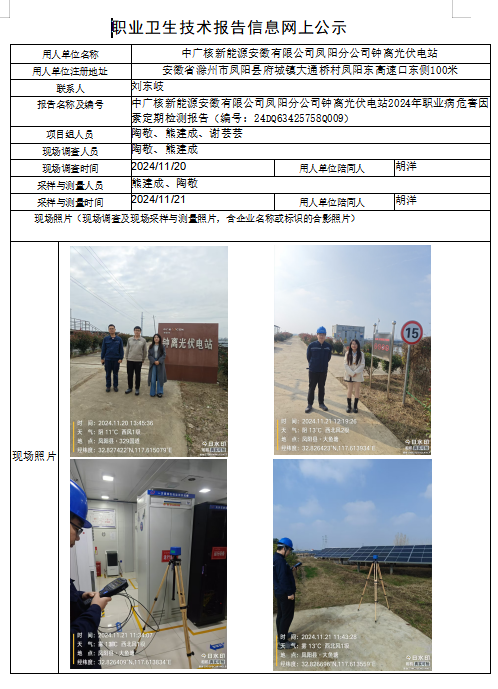 中廣核新能源安徽有限公司鳳陽(yáng)分公司鐘離光伏電站2024年職業(yè)病危害因素定期檢測(cè)報(bào)告(編號(hào):24DQ63425758Q009)