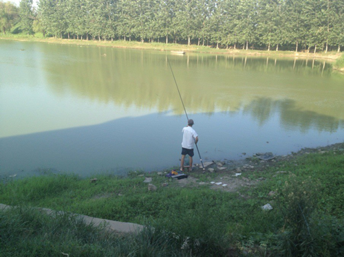 (圖為居民在護城河旁釣魚)